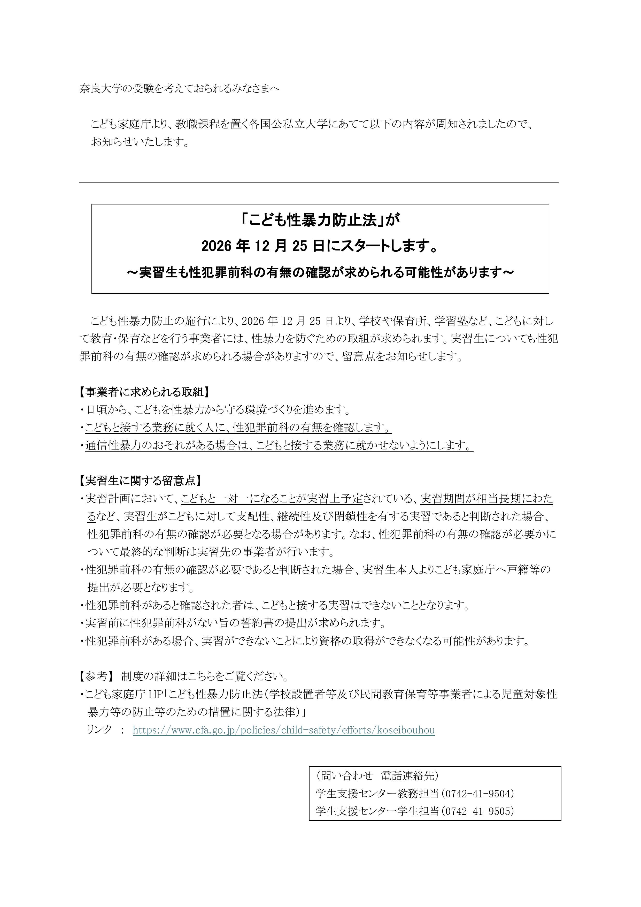 子ども性暴力防止法の施行を見据えた令和8年度以降に入学する学生への留意点について