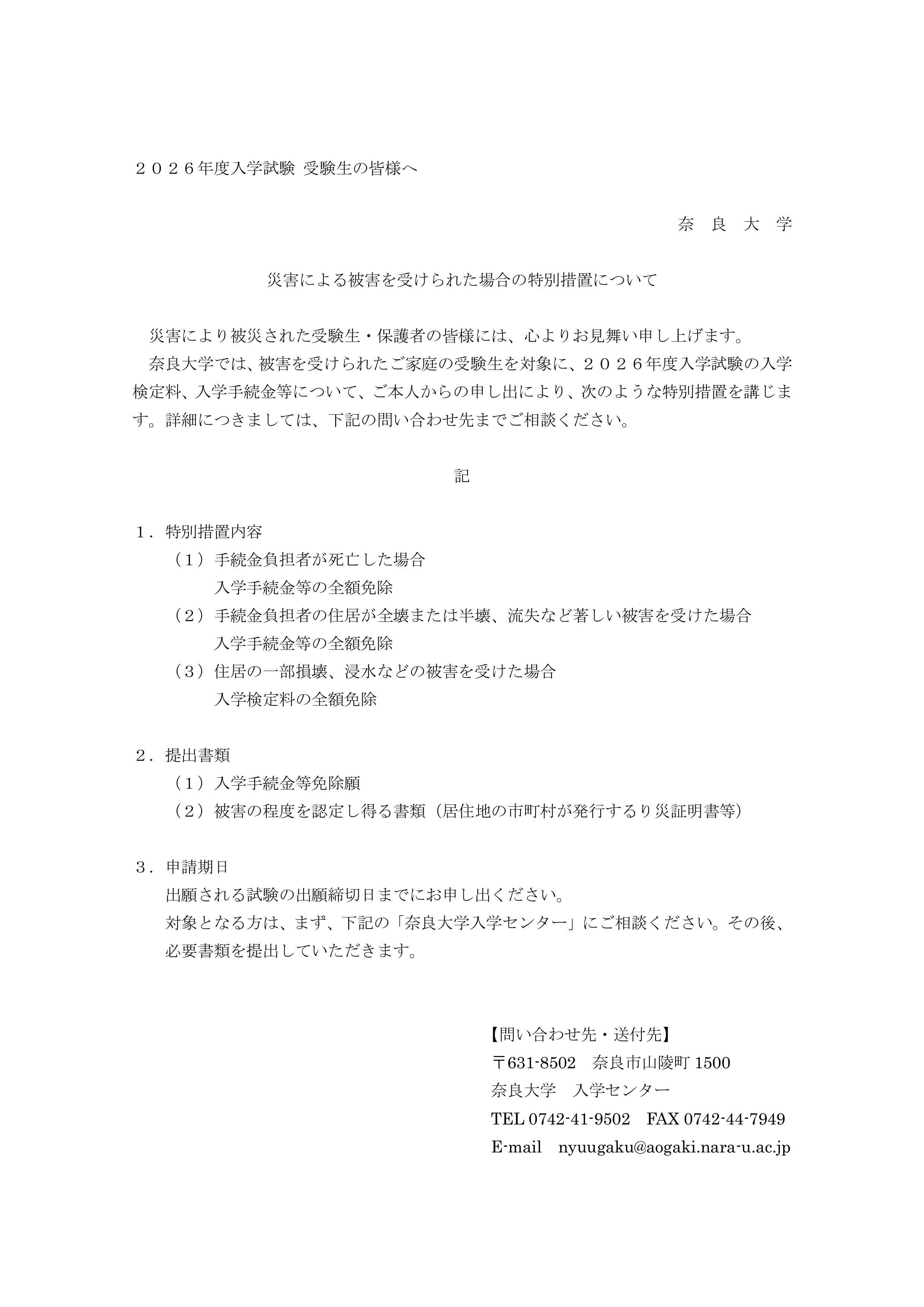 災害による被害を受けられた場合の特別措置について(2026年度入試用)