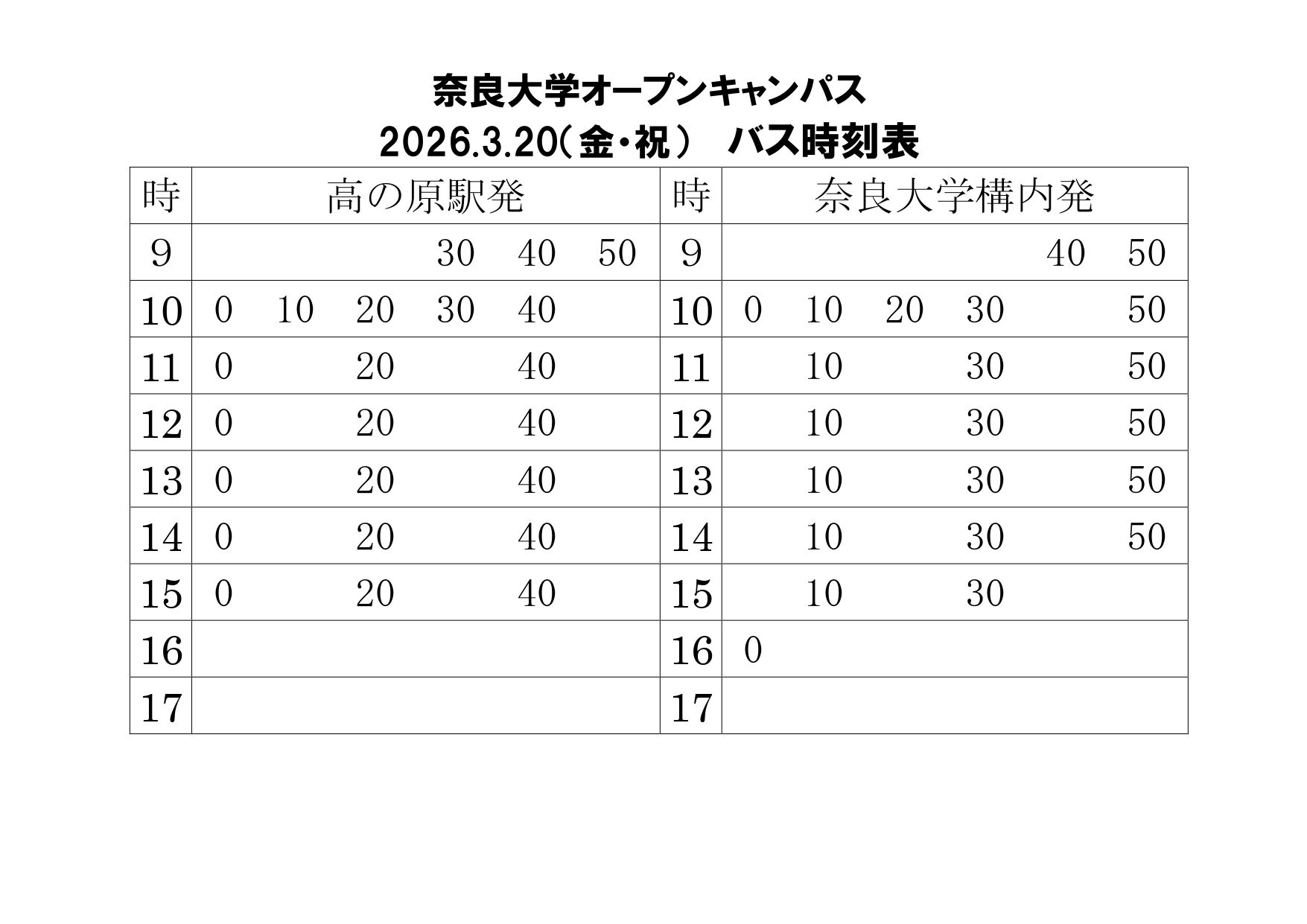当日は高の原駅から大学まで無料バスを運行しますのでご利用くださいね(始発は9:30に高の原駅出発予定。10~20分間隔で運行。)