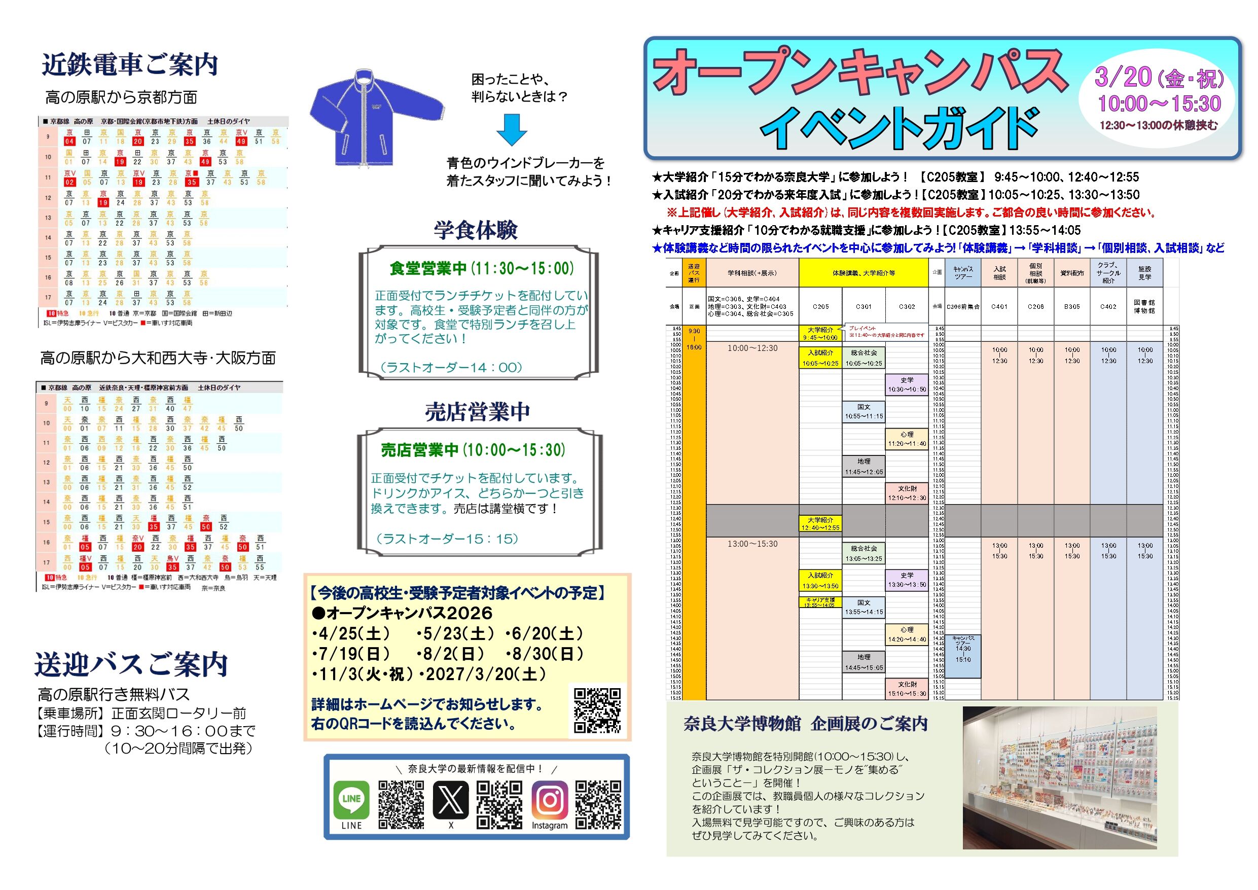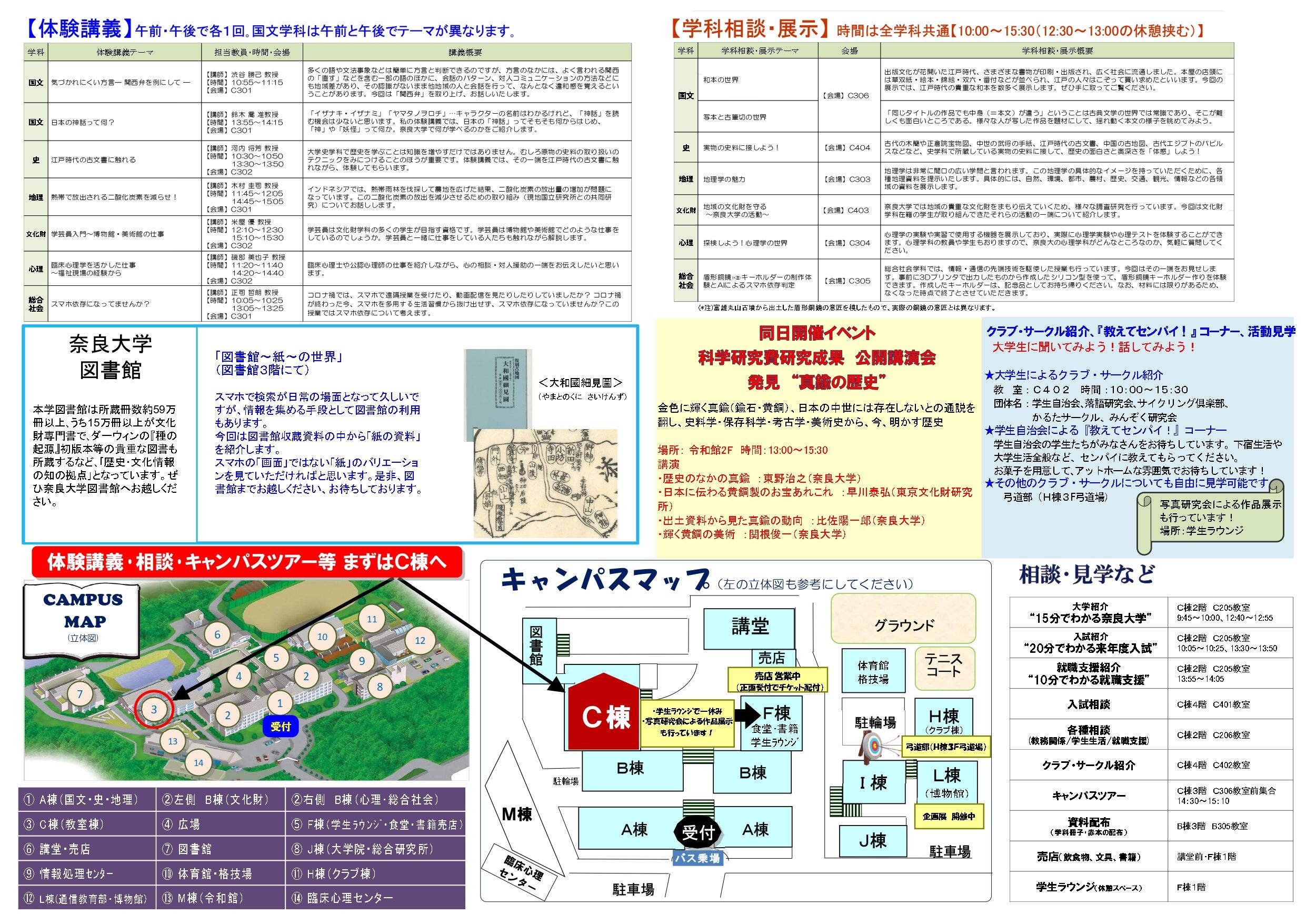 体験講義(各学科20分)、教員による個別相談、大学紹介「15分で分かる奈良大学」、入試説明会「20分で分かる来年度入試」、キャリア支援紹介「10分でわかる就職支援」、入試相談、学生生活個別相談、図書館資料紹介「図書館~紙~の世界」、学生自治会等による「教えてセンパイ!」コーナー、施設見学、資料配布などを実施予定です!