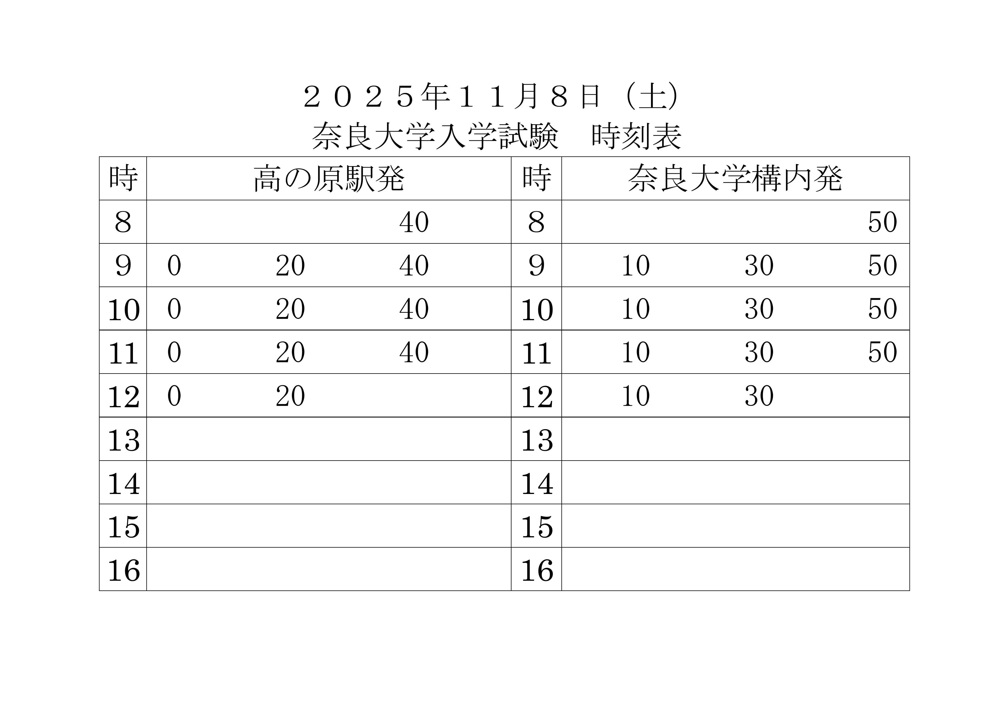 近鉄高の原駅から本学まで無料臨時バスを以下の通り運行します。