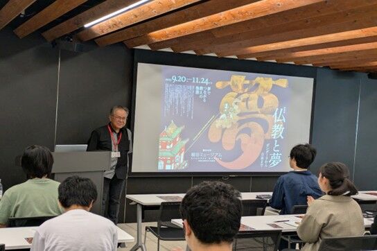 見学前に、京都国立博物館学芸部研究員(担当分野:彫刻)の竹下繭子先生に展覧会のみどころについて解説していただきました。竹下先生は奈良大学文化財学科出身で、本学の非常勤講師でもいらっしゃいます。