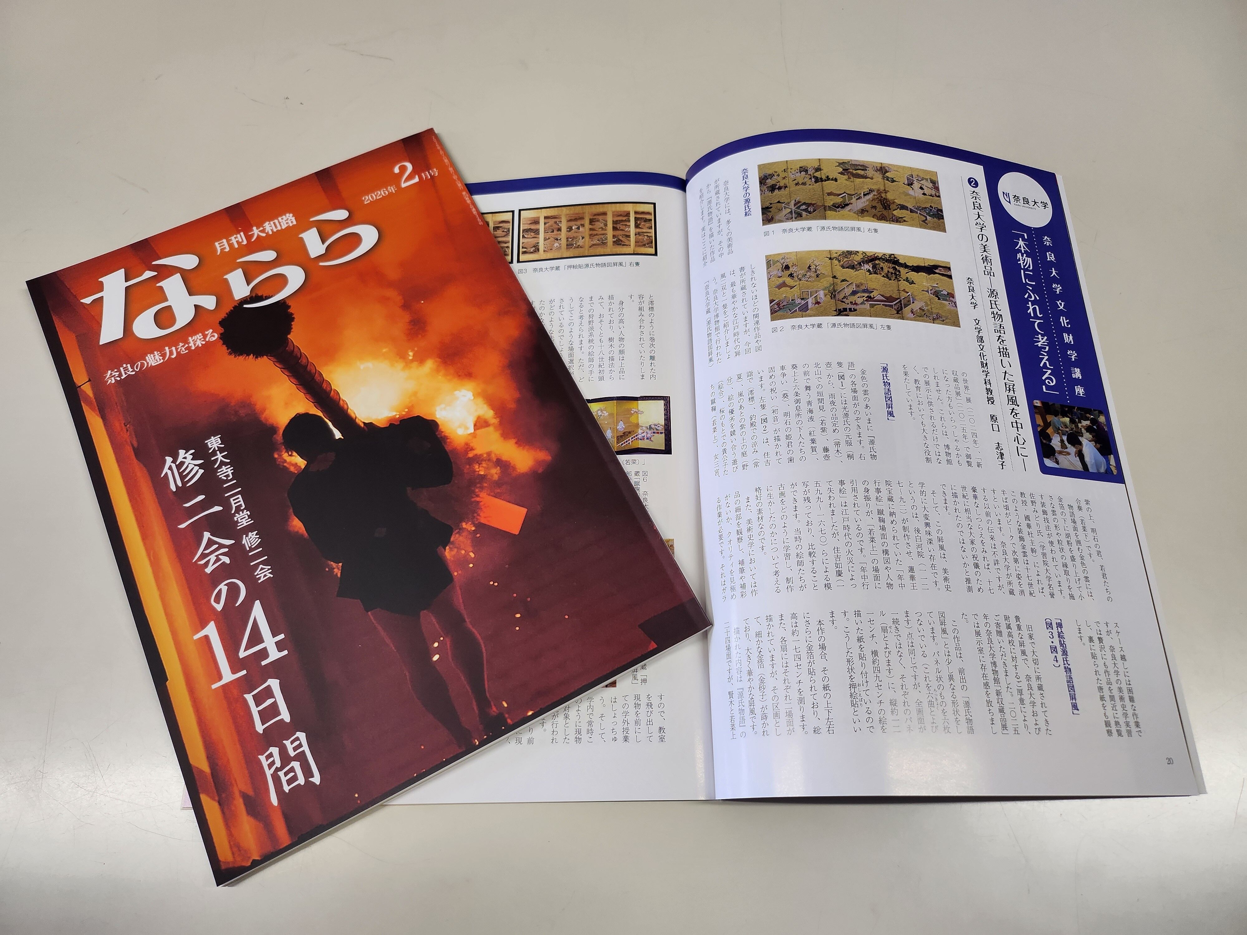 本年1月号から『月刊大和路ならら』には、文化財学科教員による新シリーズが始まりました。その第2回(2026年2月号)として、美術史の原口志津子教授による「奈良大学の美術品」が掲載されています。大学が所蔵する多くの文化財のうち、『源氏物語図屛風』『押絵貼源氏物語図屛風』『蹴鞠図屛風』など、源氏物語に関わる美術品を解説し、実物の文化財に触れながら学ぶ楽しさを紹介しています。書店で『月刊大和路ならら』(https://narara.co.jp/)を手に取って、お楽しみください。