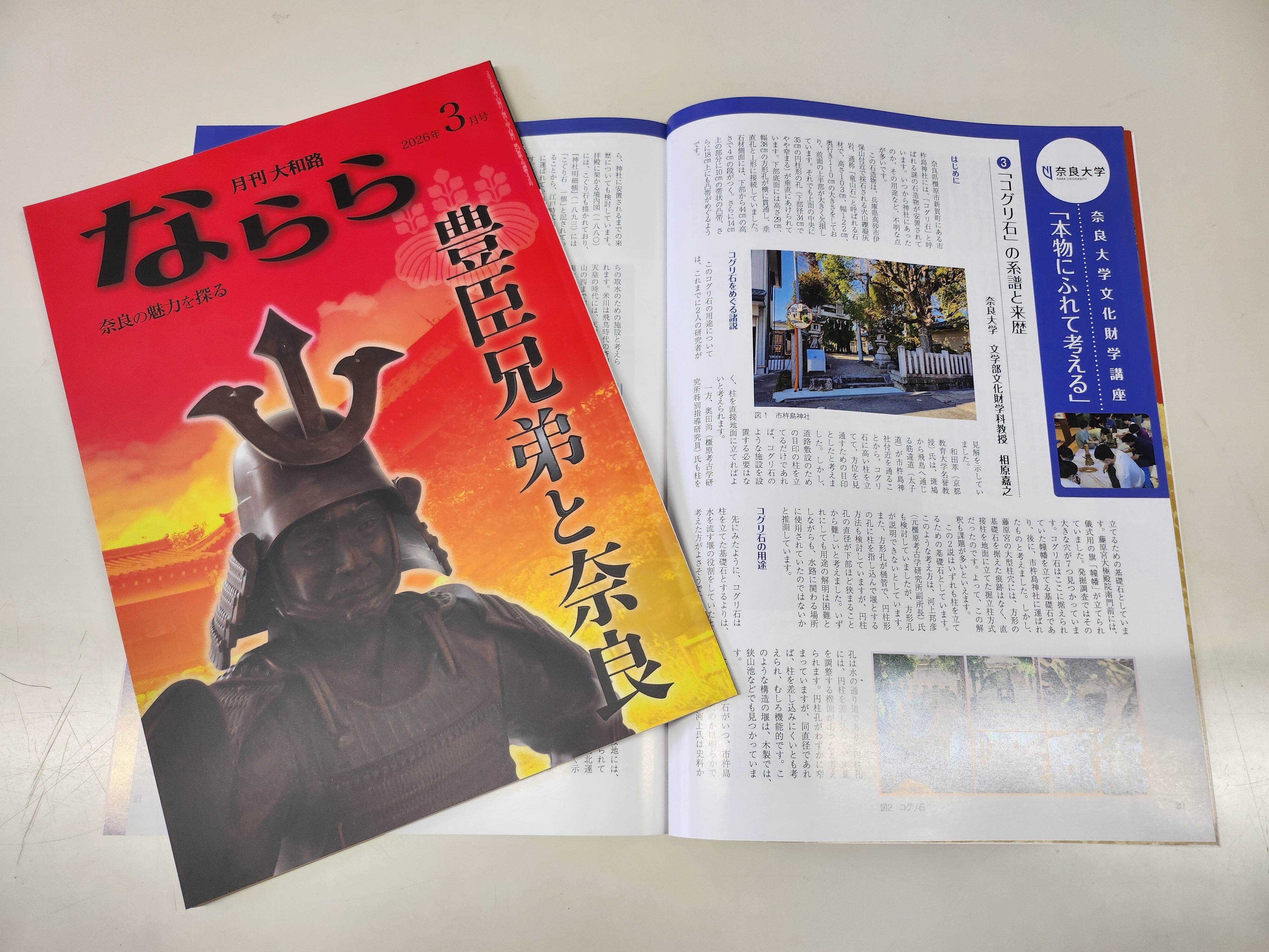 『月刊大和路ならら』3月号は、考古学担当の相原嘉之教授による「コグリ石の系譜と来歴」を掲載しています。橿原市新賀町の市杵島神社の境内に鎮座する石造物。この石造物の謎に迫ります!書店で『月刊大和路ならら』(https://narara.co.jp/)を手に取って、お楽しみください。