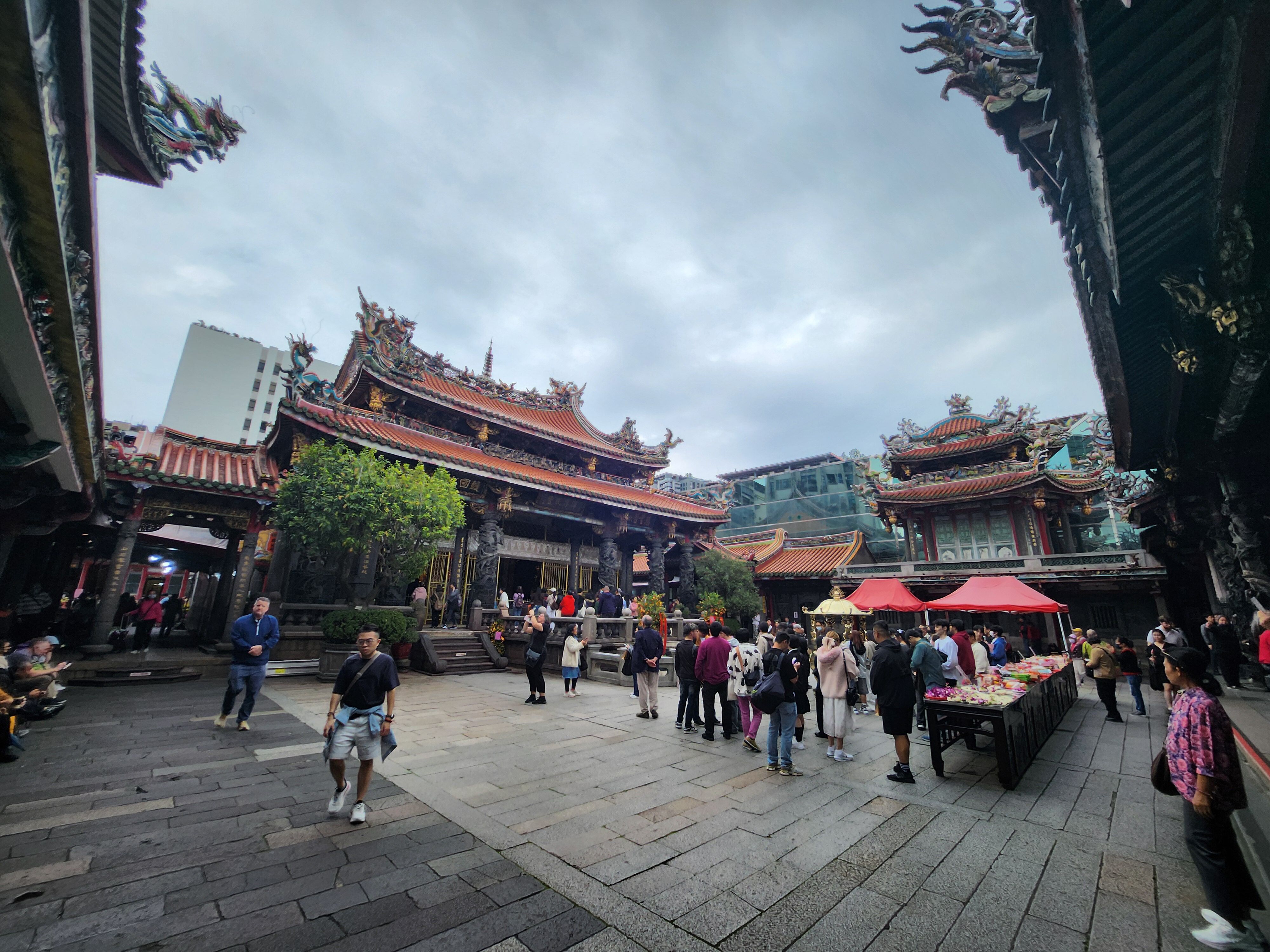 台北では、まずは龍山寺へ。清代の1738年創建の神仏融合の寺院。四合院造りの宮殿式建築の寺院。ここでは学生たちが、恋愛占いに一喜一憂。