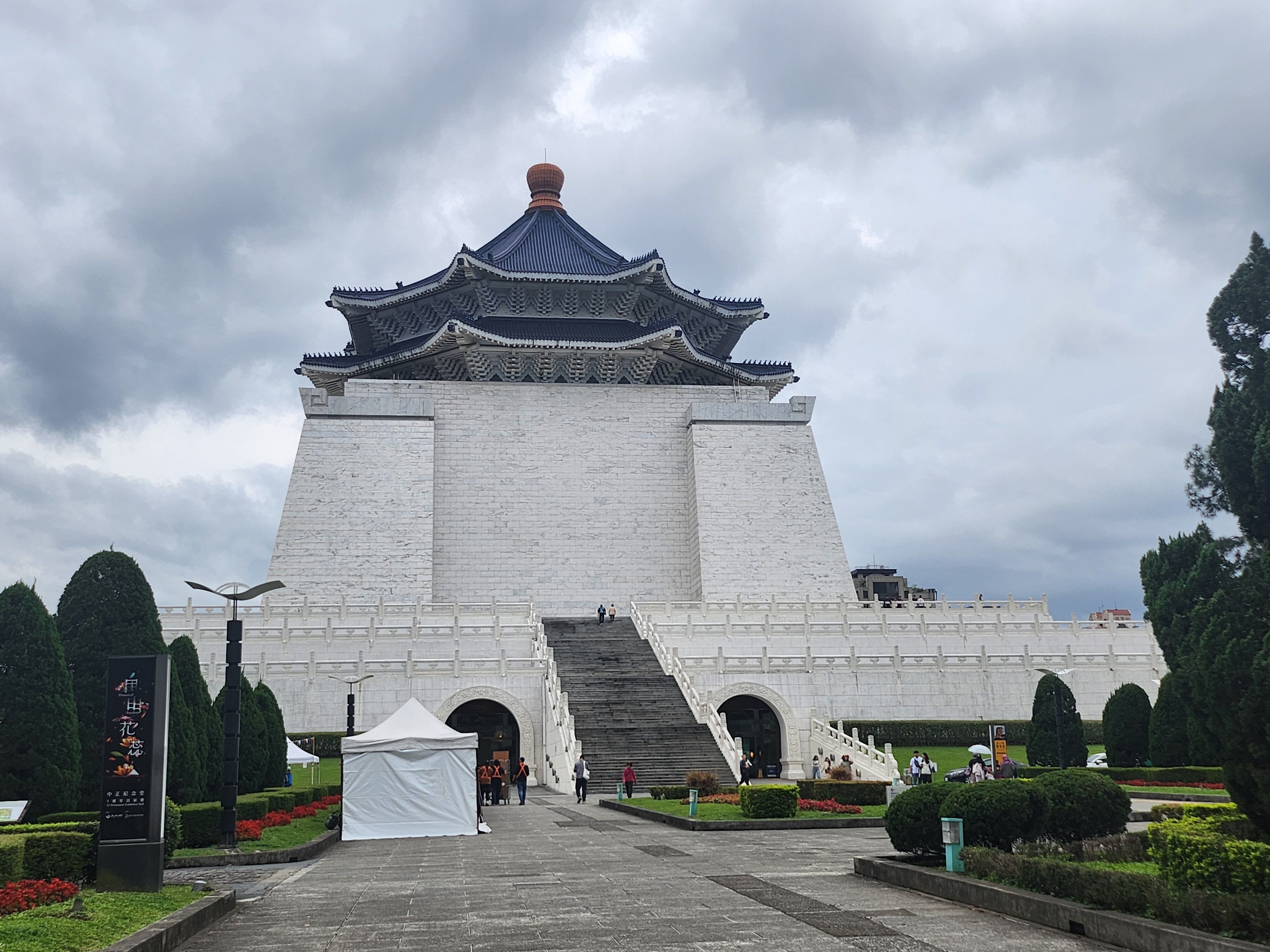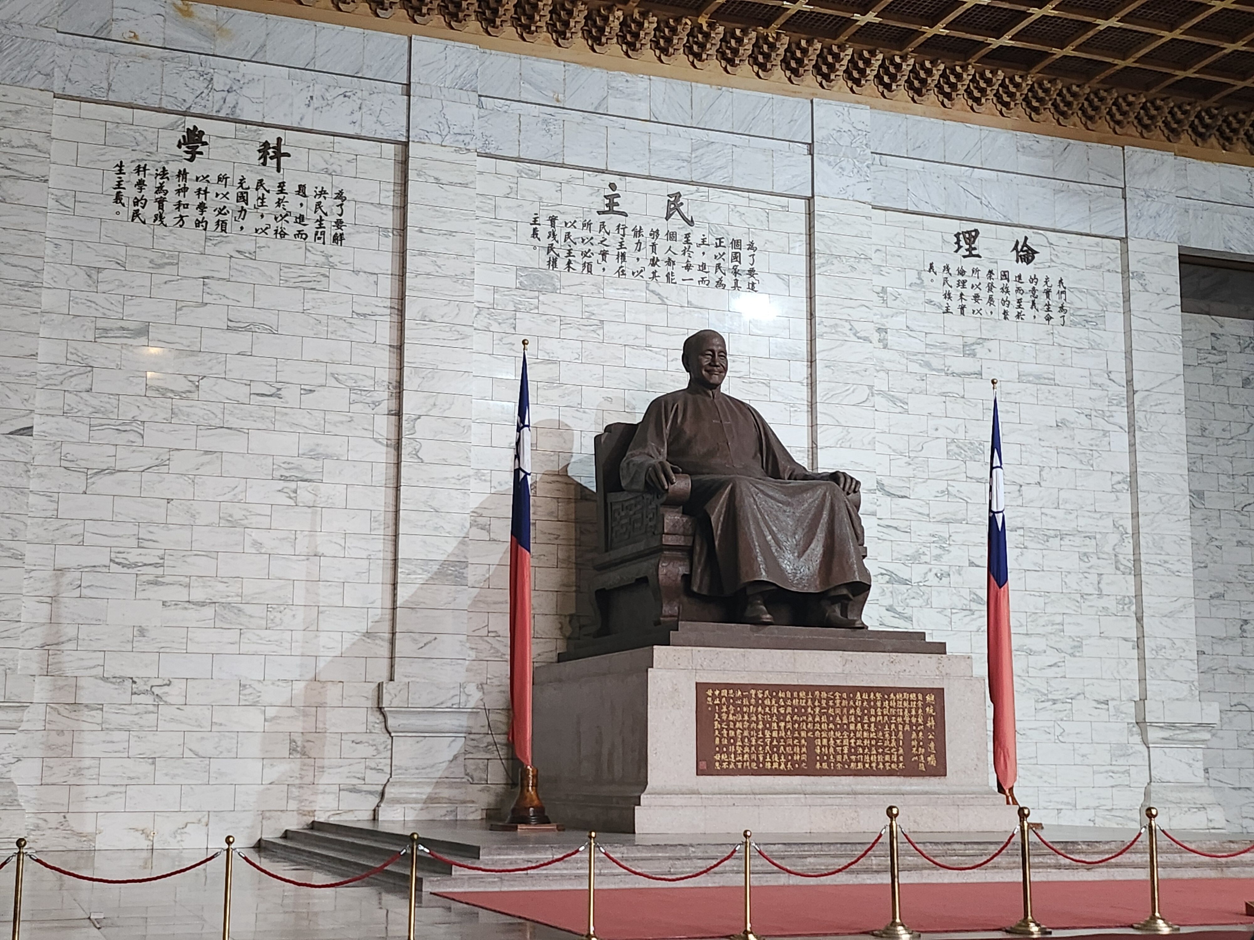 その後、みやげ物屋に立ち寄った後、中正紀念堂へ。日本統治後に台湾を統治した蒋介石(中国国民党)を記念した建物群。広大な敷地の中央の八角形の屋根の紀念堂がシンボル。その内部は、蒋介石を紹介する展示。