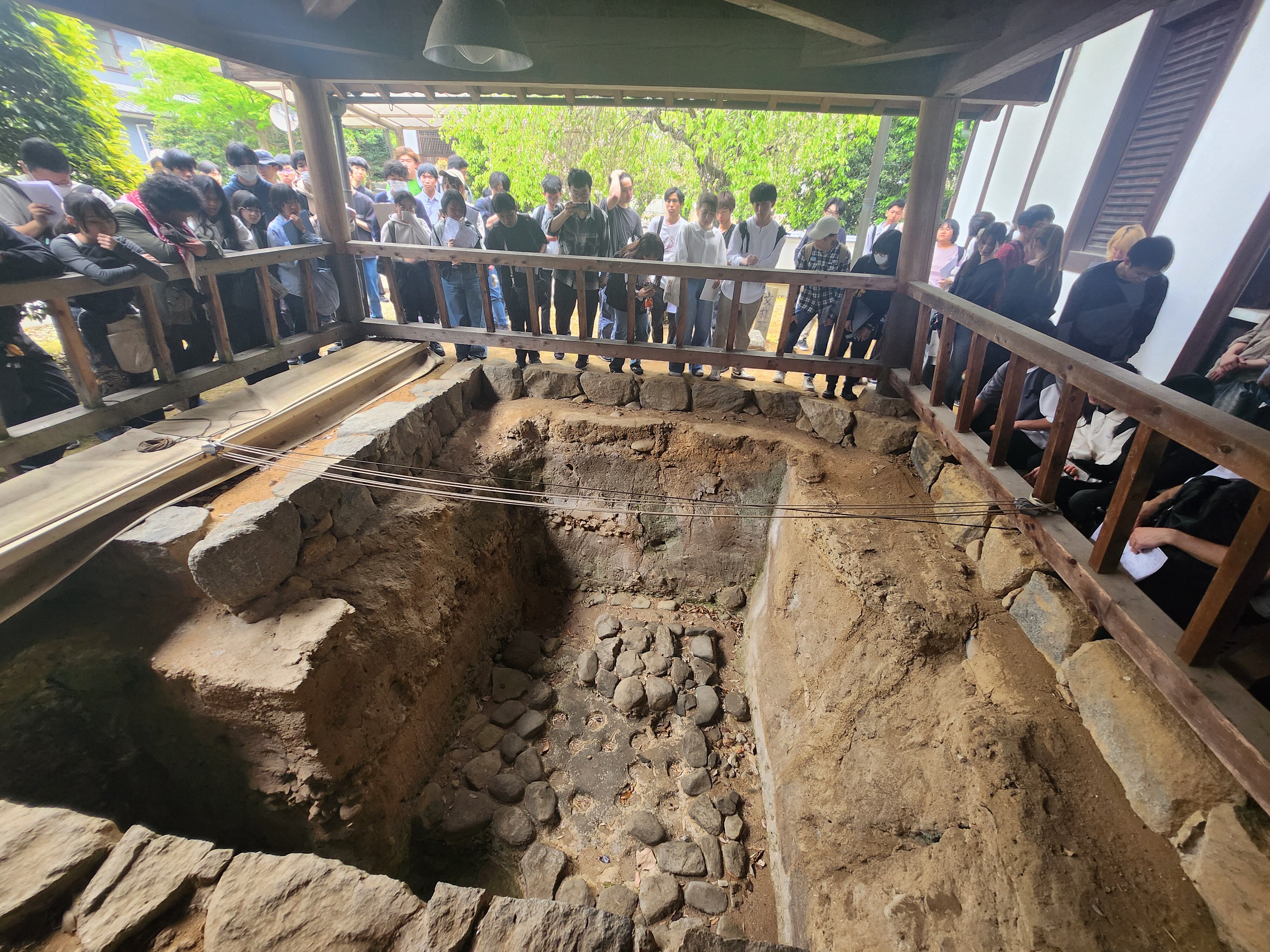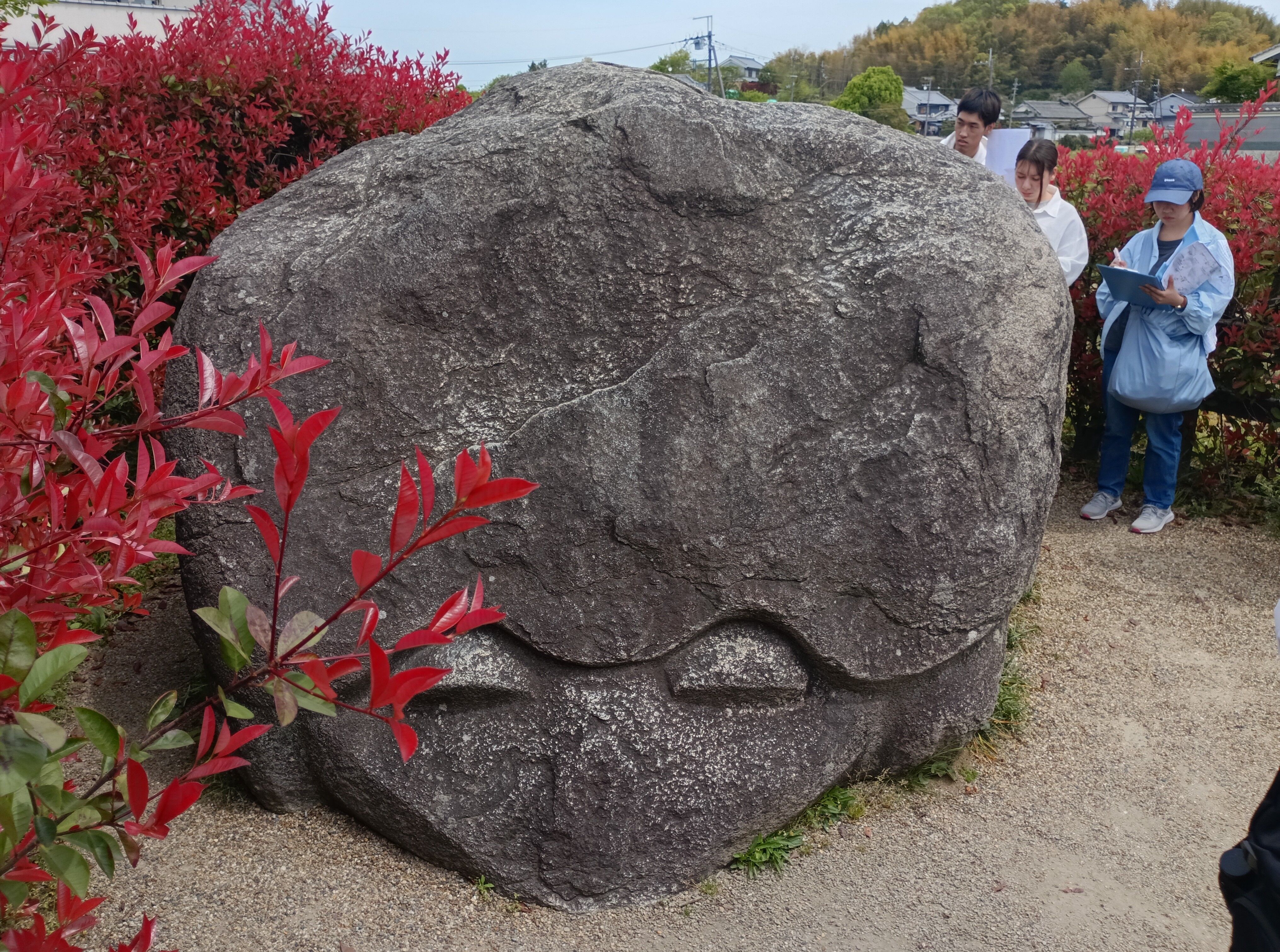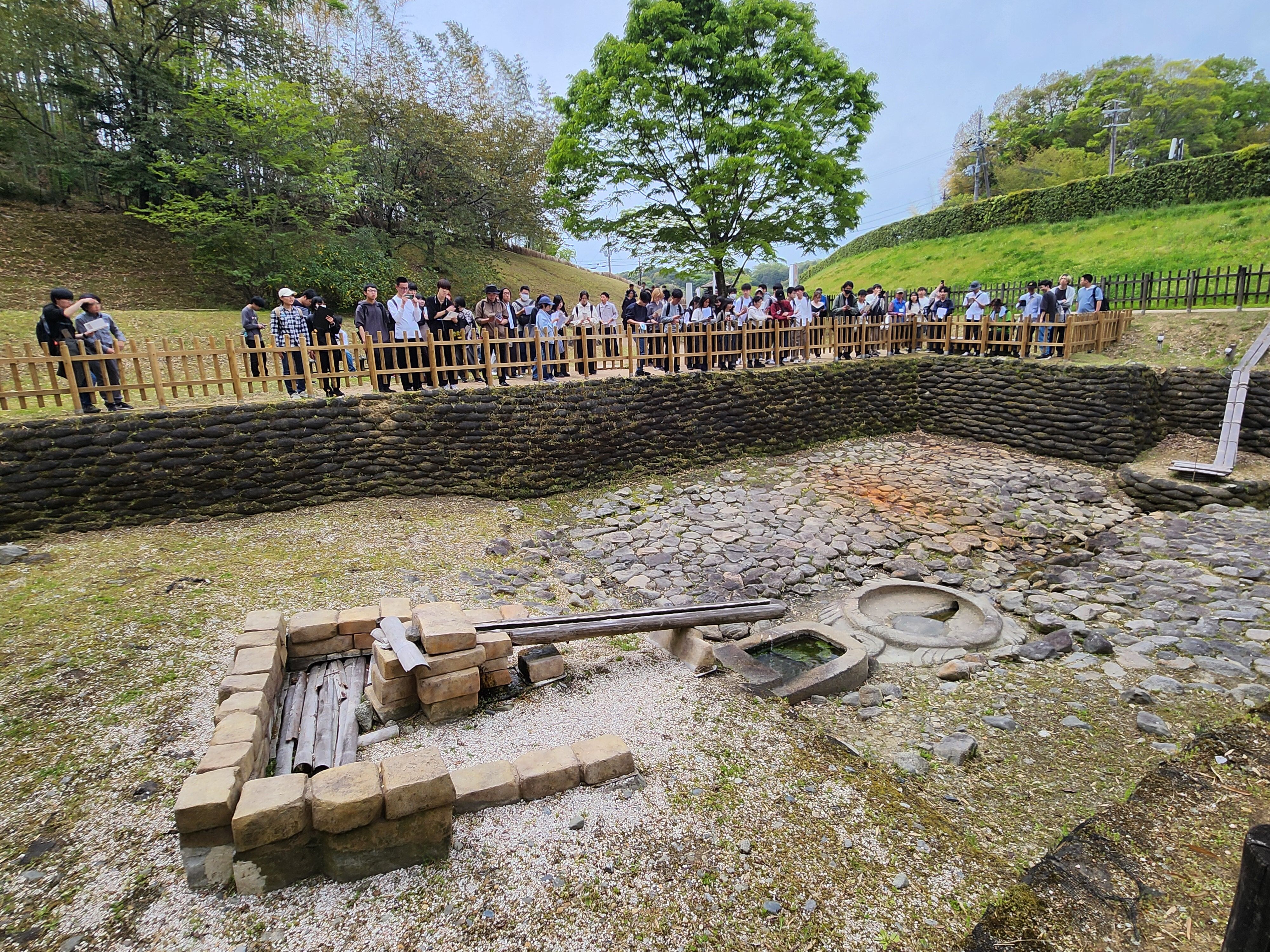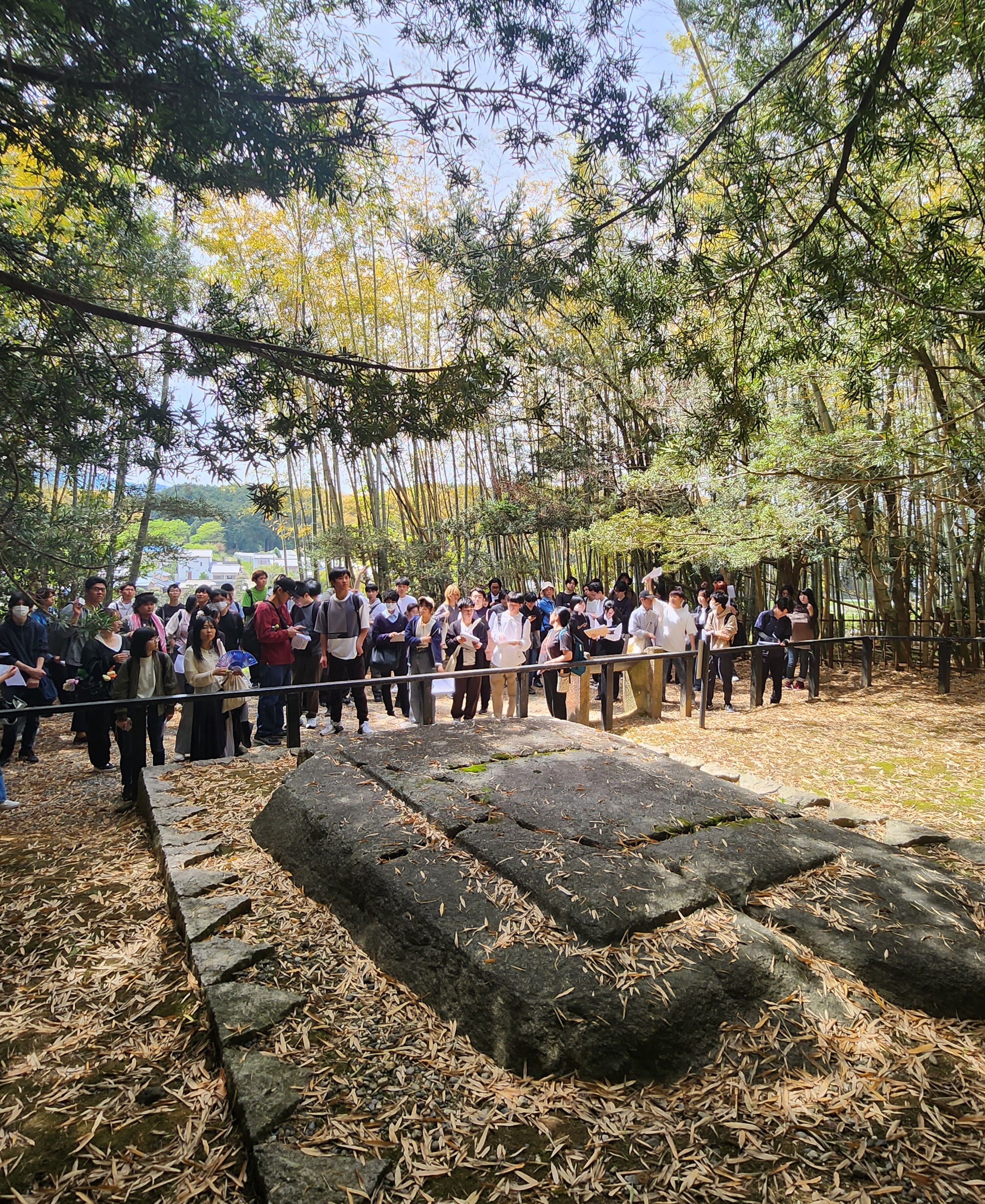 文化財演習Ⅰの学外授業として、2年生全員で明日香を巡見しました。先生の解説を聞きながら見学したのは、欽明天皇陵、鬼の俎(まないた)・雪隠(せっちん)、天武・持統合葬陵、亀石、川原寺、飛鳥宮跡、酒船石、飛鳥池遺跡、飛鳥寺、水落遺跡(飛鳥時代の水時計)、豊浦宮跡と、盛りだくさん。学生さんたちは、友人たちと楽しそうに史跡について話したり、時には教員に質問をしたりしながら歩いていて、充実した学外授業となったようです。