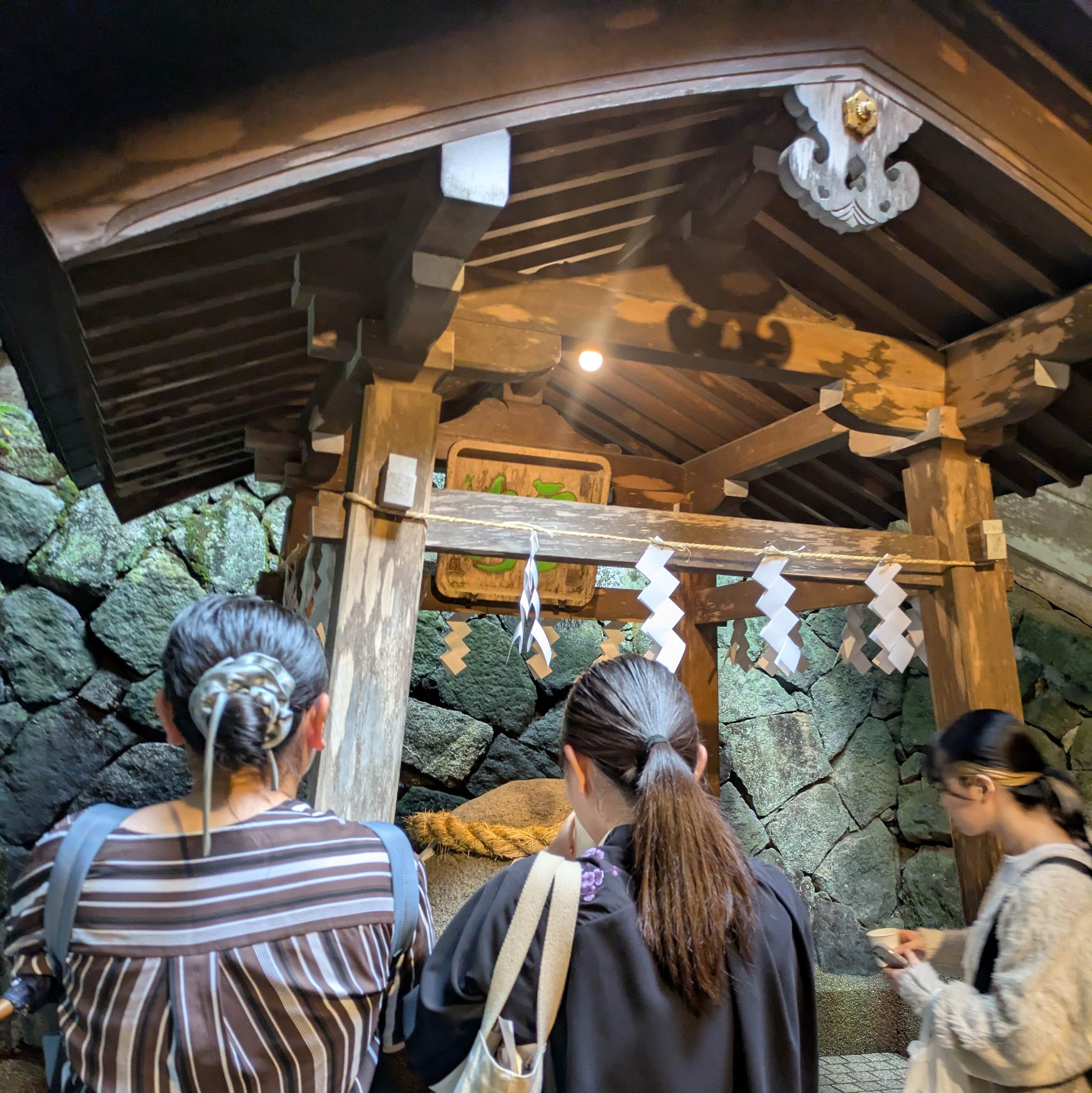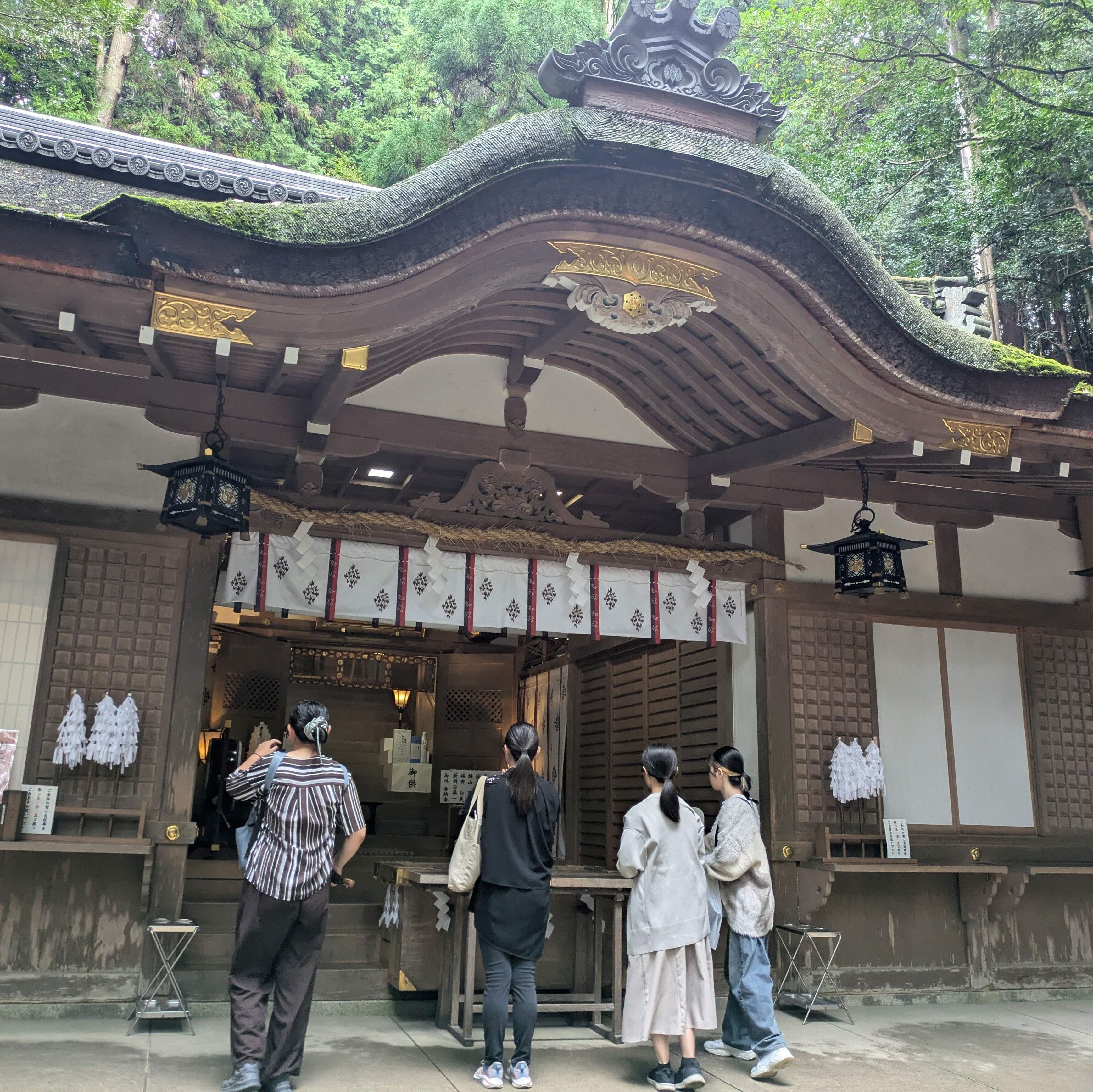 大神荒魂神を主神として、大物主神・の姫蹈鞴五十鈴姫命・勢夜多多良姫・事代主神を祀っています。「華鎮社」とも「しずめの宮」ともいわれ、荒々しい御魂のはたらきで病魔を退散、病気を鎮める神として信仰されています。「養老令」や「延喜式」に「鎮花祭」が行われていたことが記述され、百合根を供え、疫病封じの「薬まつり」がおこなわれています。また拝殿後ろに万病に効く薬井があります。学生の健康祈願をし、口を潤し、歩をすすめました。