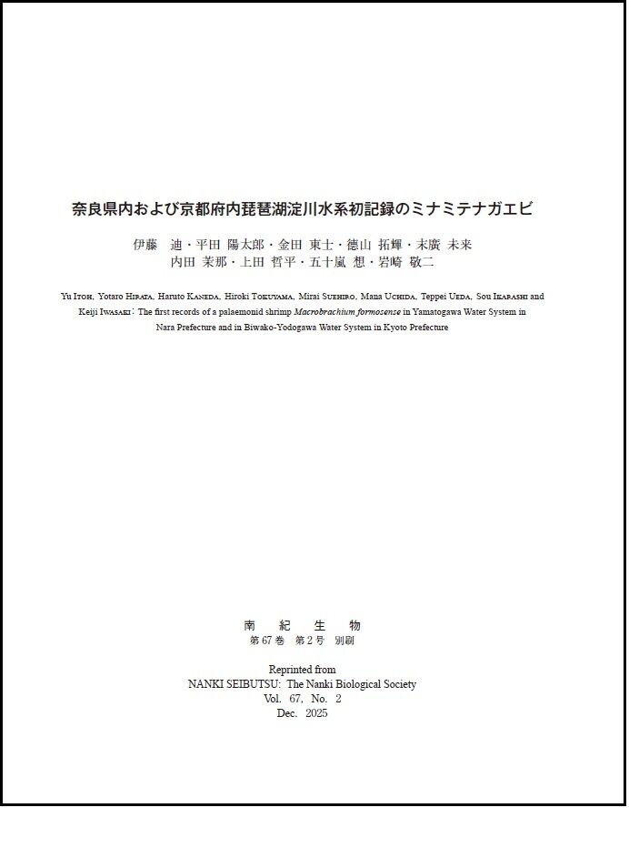 その調査結果と、過去の奈良県および京都府のテナガエビ類の生物地理学的情報をまとめた論文を、本学地理学科4年生の伊藤 迪(いとう ゆう)さんが筆頭著者となって執筆し、2025年12月中旬に「南紀生物」という雑誌で公表されました。