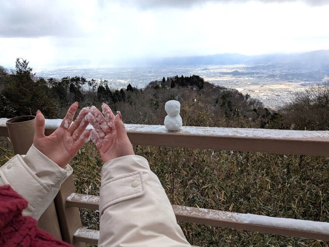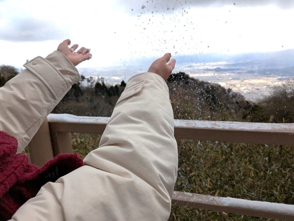 雪雲のカーテンがかかっていましたが、奈良や大阪の景色を眺めることができました。雪景色とともに普段とは異なる景を楽しむことができました。