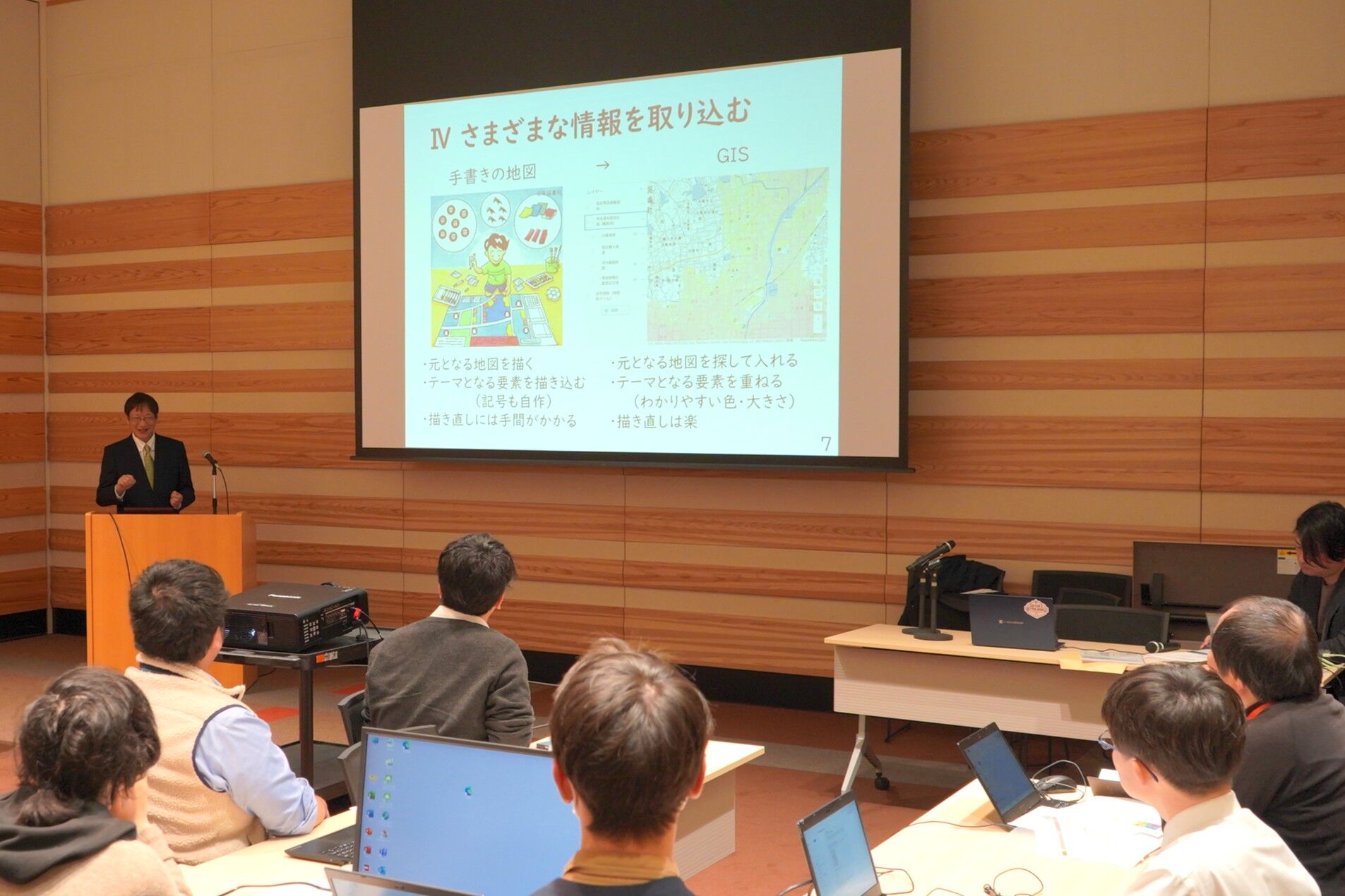 本研修会は、行政サービスで頻繁に使われる地理空間情報を一段と有効活用できるよう県職員の技術力アップを目的としており、木村教授の講義と参加者によるグループワークが行われました。