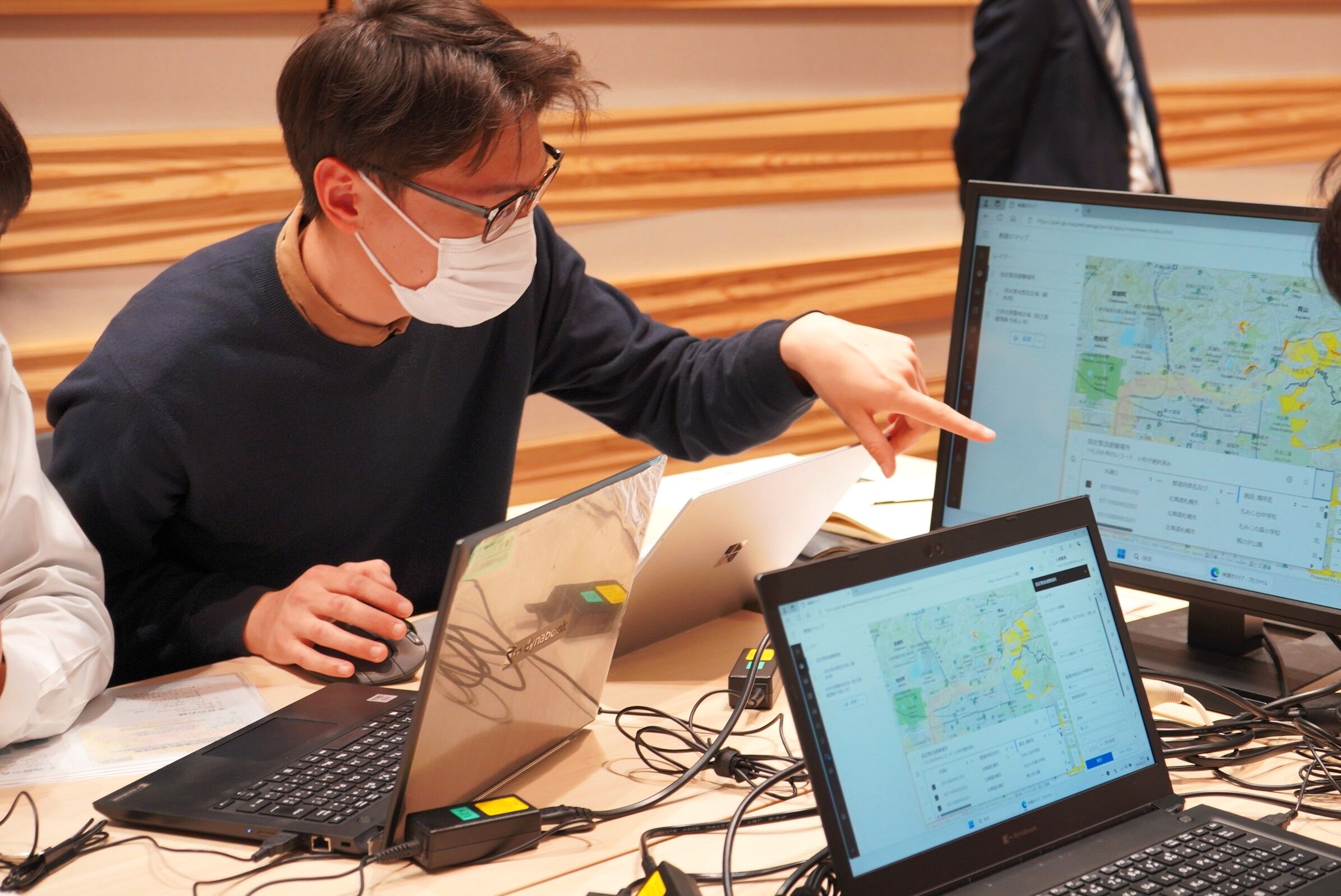 研修会後半のグループワークにおいては、複数グループに分かれて交通、防災、観光など様々な視点でのマップ作りが行われました。各グループにアドバイザーとして同席した奈良大生たちは、地図データの説明や扱い方、PC操作の補助など職員の皆さんが感心するほど積極的に行動し、普段のGIS学習・研究の成果を発揮していました。
