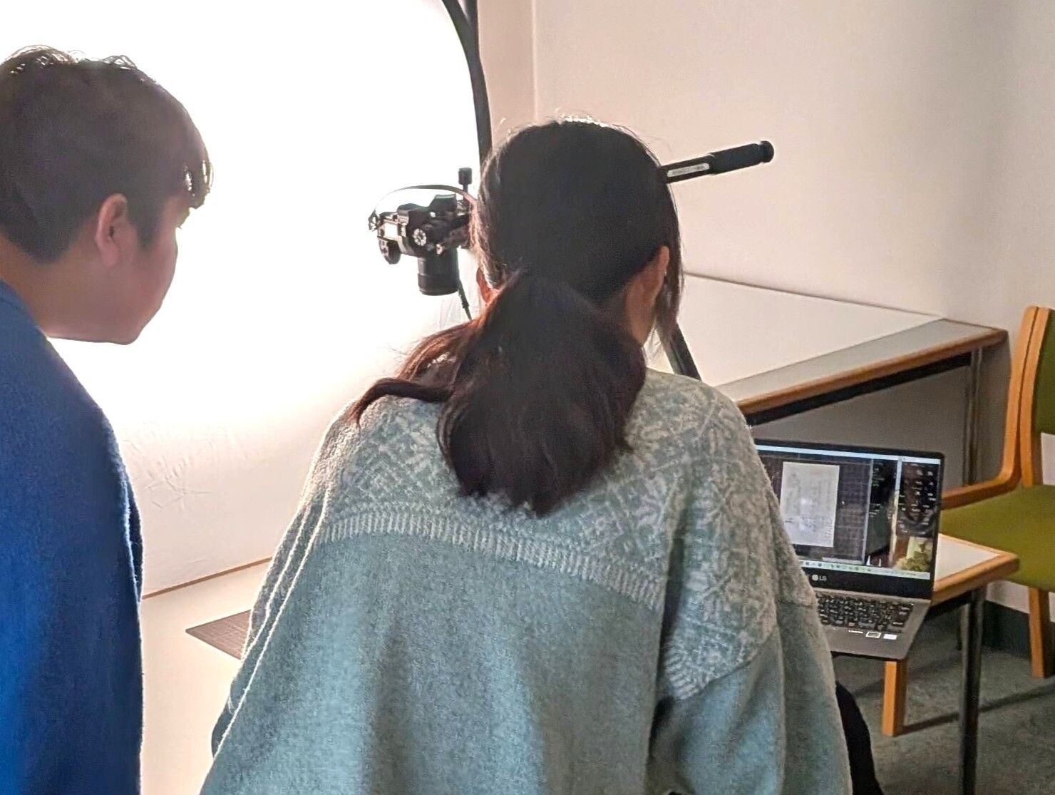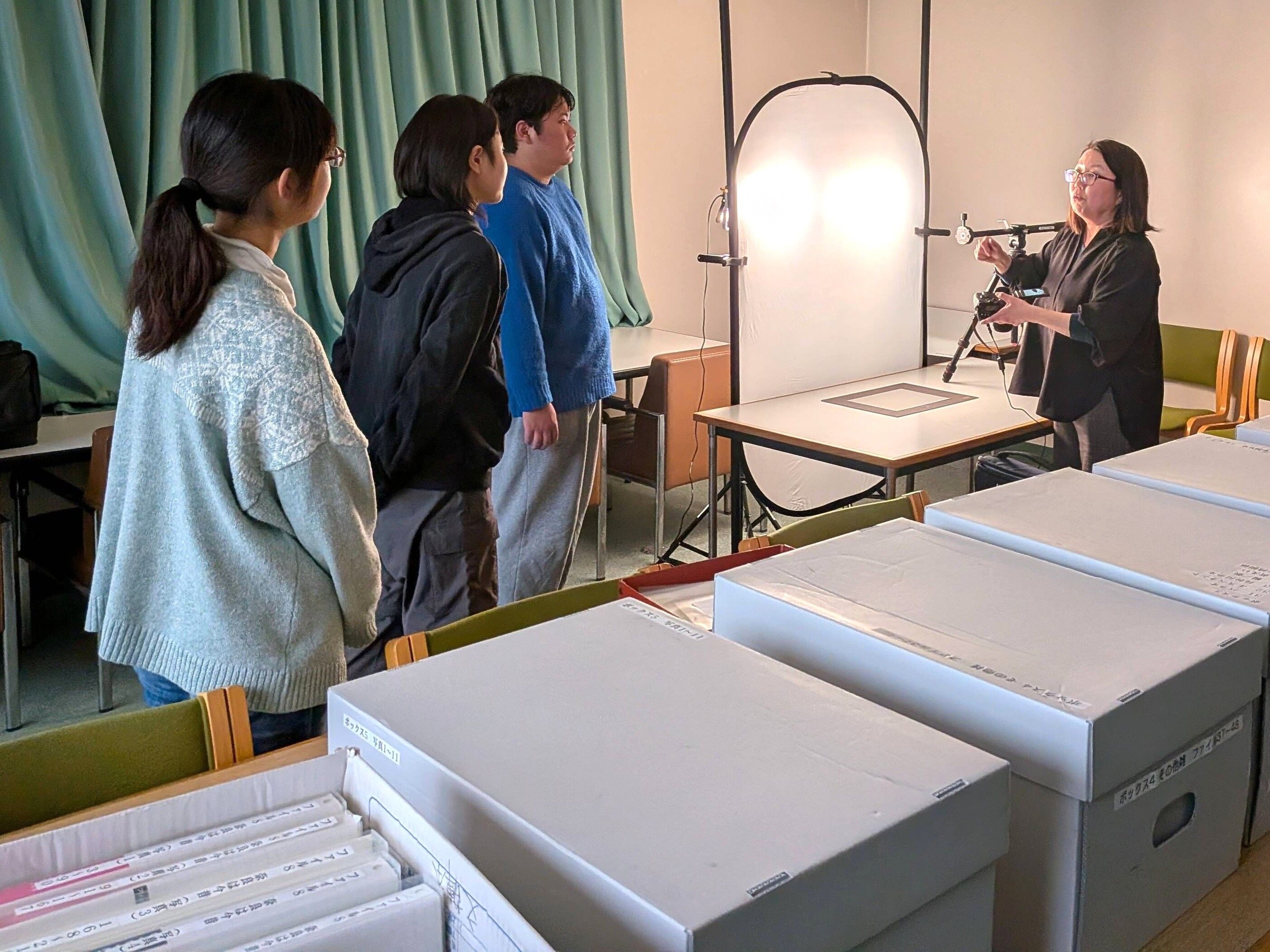 蔵書点検で休館中の図書館にて、国文学科の光石亜由美教授(近代文学)と学生たちが、
