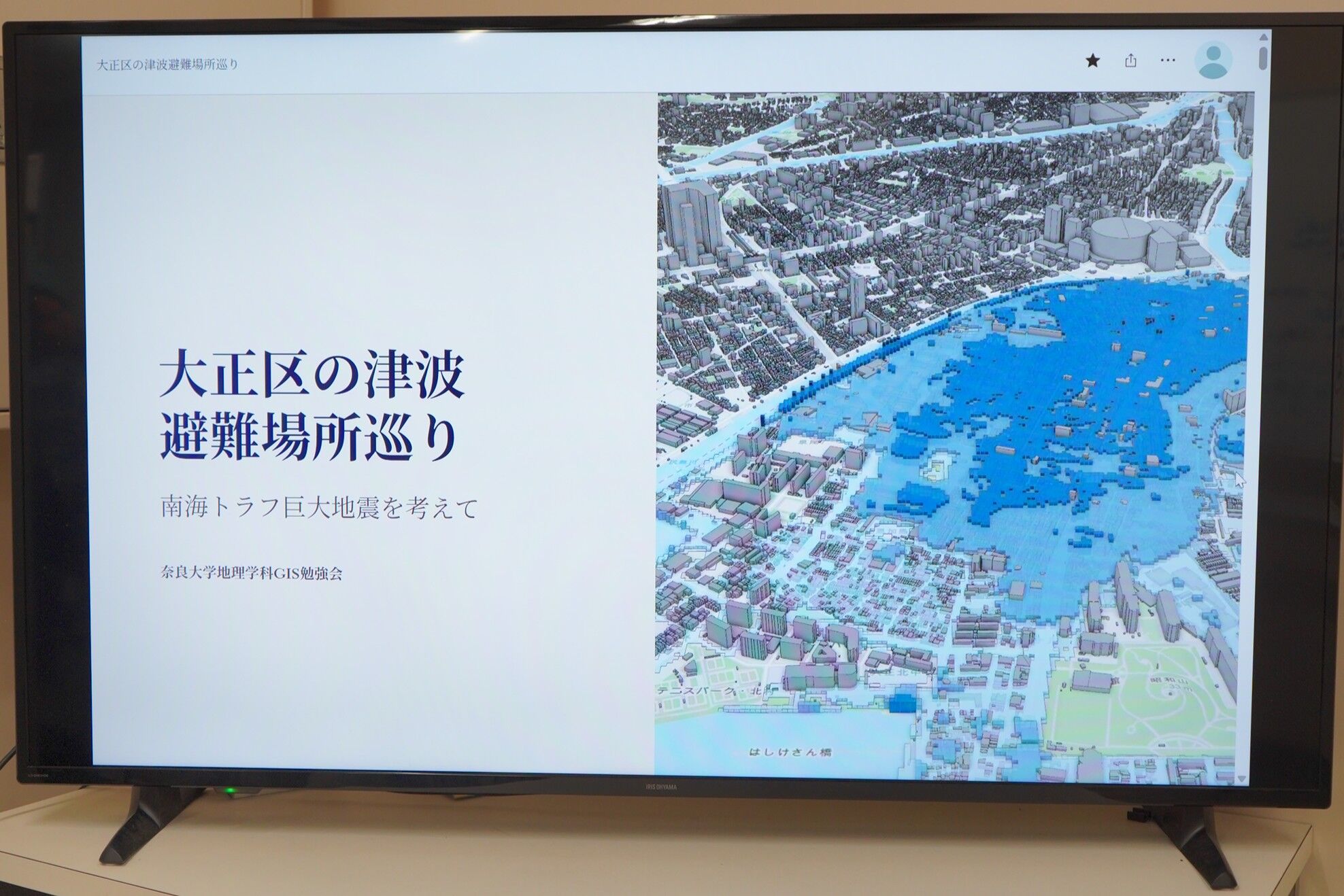 このたび「GIS勉強会」に参加する学生らが、GISを活用した津波被害の予測、避難所への移動などを3次元画像で可視化。その作業・調査の様子がNHK奈良放送局で特集されました。