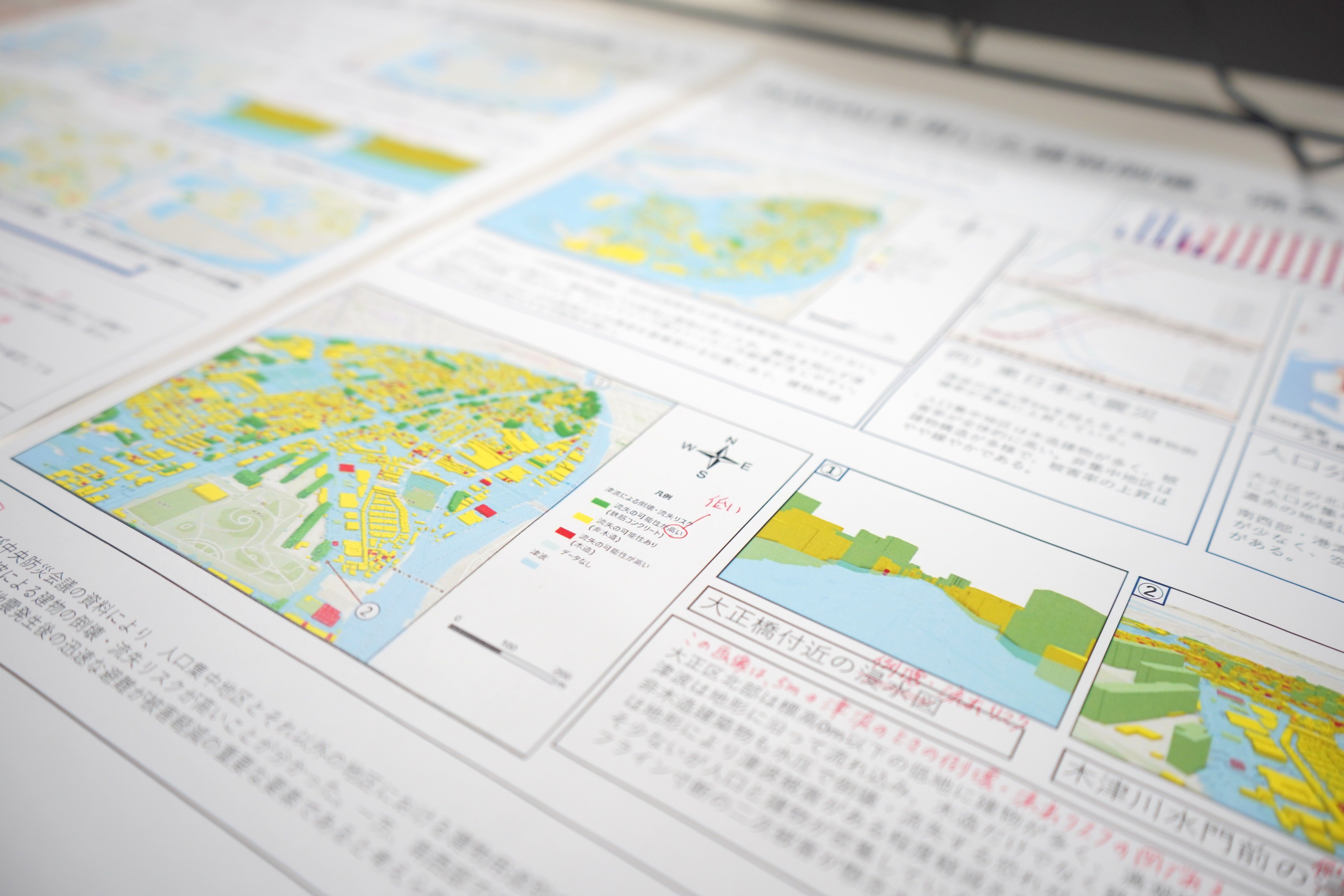 学生らが対象としたエリアは大阪市大正区で、区域の大半が"0メートル地帯"です。この区域が津波で浸水した場合の被害予測や、複数の避難所へ年齢・世代で分かれて避難できるように、3次元画像で分かりやすく表現しました。また、大正区役所のご協力も得て、木造・鉄筋など構造も区別して地図の精度を高めました。